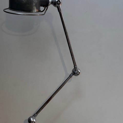 Klassisk Jielde væglampe. Bauhaus stil. Fransk design. Med sort stofledning. Monteres på væggen med to skruer. Kan bøjes i armen så hovedet tipper/vendes. Afhentning i Silkeborg.