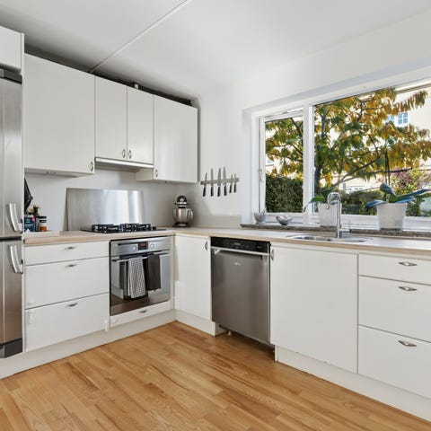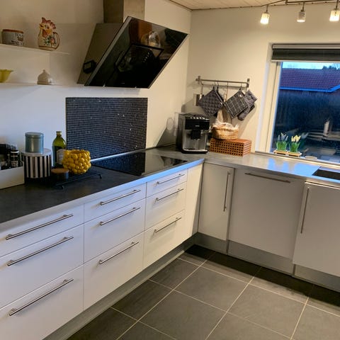 Hvidt køkken med skabe, bordplade og hårde hvidevarer