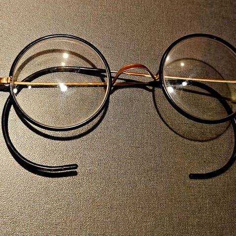 antik, antikke briller, vintage briller, gamle briller, runde briller, metalbriller, historiske briller, ca 1900, 1920erne, samlerobjekt, rekvisit, teaterrekvisit, filmrekvisit, udstilling, dekoration, curiosa, kuriositet, optik historie, retro eyewear, steampunk, herrebriller,