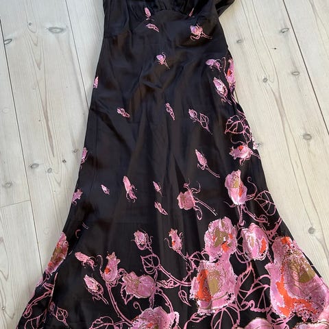fest/cocktailkjole i størrelse 38. Kjolen er i blå polyester og har en lang, elegant pasform. Modellen har stropløs overdel med syninger, der giver form, samt vid nederdel med let asymmetrisk fald. Velegnet til festlige lejligheder som bryllup, galla eller andre formelle begivenheder.
