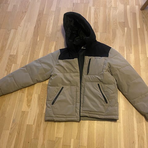 Jack & Jones vinterjakke til herre i størrelse L. Jakken er beige og fremstillet i akrylmateriale. Modellen er en vatteret vinterjakke med hætte, gennemgående lynlås foran og høj krave. Velegnet som yderjakke