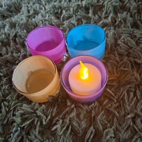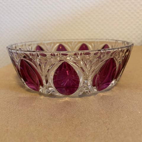 4 stk små firkantede glasskåle, klar, rosa og lilla i sammer mønster, + klar i andet mønster, samlet 75 kr.