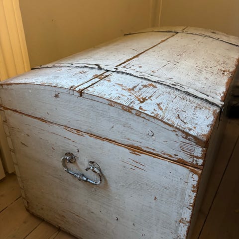 Kisten har brugsspor: der mangler håndtag på den ene side samt låg kan løftes helt, men fin til opbevaring eller sofabord evt. med en glasplade ovenpå - også til sommerhuset.