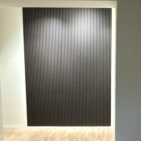 Akustikpanel vægpaneler lameltræ eg med sort baggrund