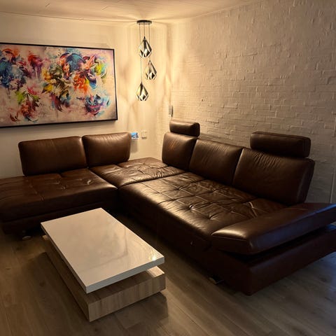 Lækker hjørnesofa med chaiselong i sort læder og koldskum. Med runde stålben. Sælges uden nakkestøtter. Sofaen er 8 år gammel. Sofaen bærer præg af katteklør, dog ikke overalt, se billede 2 og 3. Nyprisen var 22.000kr. Bud modtages