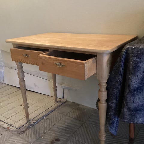 Fint gammelt bord med en skuffe. Kan bruges til allround spisebord skrivebord køkkenbord. Antikt. Hvidmalet.