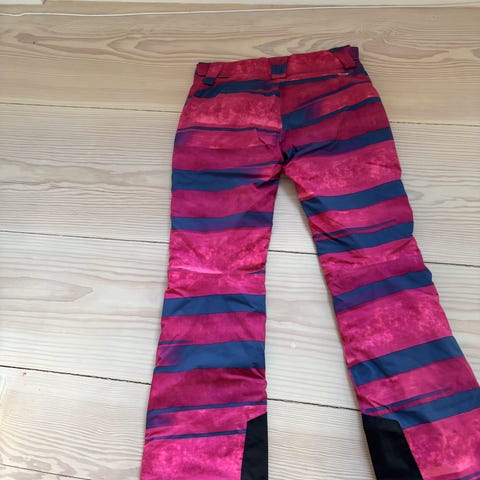 Salomon skibukser i rød farve i størrelse L. Kun brugt 1 uge. Bukserne har lynlåslukning og trykknapper i taljen samt lynlåslomme foran. Forstærkning ved underbenene. Velegnet som ydre lag til skiløb og anden vintersport. Mangler en knap, se billedet. Derfor prisen.