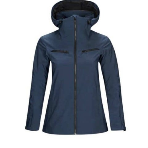 Peak Performance Hipe dame-skijakke / skaljakke i størrelse S. Jakken er primært hvid med røde skuldre og hætte og grå striber. Den har lynlåslommer i siderne samt en indvendig lynlåslomme oppe ved brystet, indvendig lomme samt lynlåslomme til liftkort i ærmet. Hipe-materialet er udviklet til at være vind- og vandafvisende samt åndbart, egnet til brug på ski. Det er også lynlås under armene til ventilation.