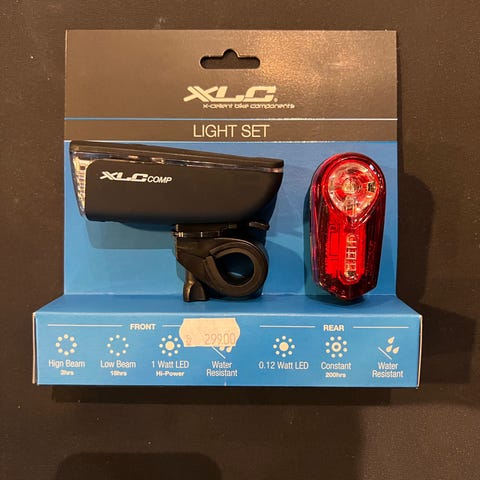 Lezyne Macro Drive og Micro drive cykellygtesæt. De fejler ikke noget. Elastikken til holderen til forlygten er gået i stykker, så den sættes på med fx strips.