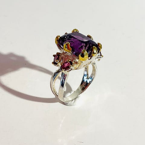 Eksklusivt håndfremstillet unika Ametystring af 14K guldbelagt sterlingsølv prydet med stor ca. 28 ct. dråbe facetslebet naturlig lilla ametyst, omkranset af mindre rhodolit granater. Ametyst måler 20 x 17 mm. Vægt 16,3 g. Ringstørrelse 55. Leveres med smykkeæske.