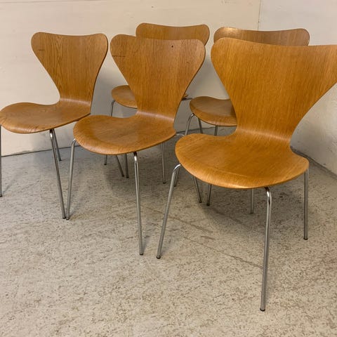To godt brugte 7' er stole. Trænger til en kærlig hånd. Kapsel mangler den ene stol. Er produceret i 1969. Prisen for begge stole