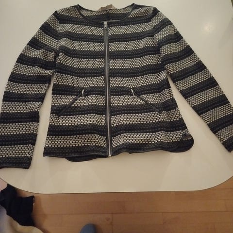 Pæn lang åben strikcardigan m. 2 lommer foran. Fra skulder til bund måler den ca. 73 cm.