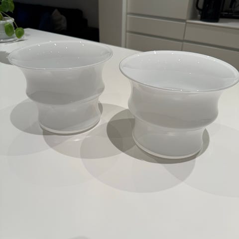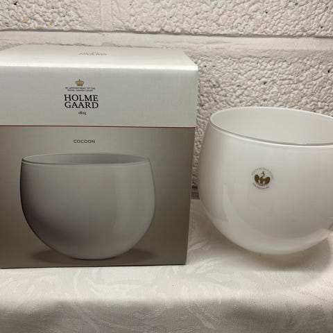 Holmegaard RC urtepotte i hvidt glas. Krukken har en cylindrisk form med svagt buet midterstykke og markeret fod og kant foroven. Overfladen er glat og ensfarvet.