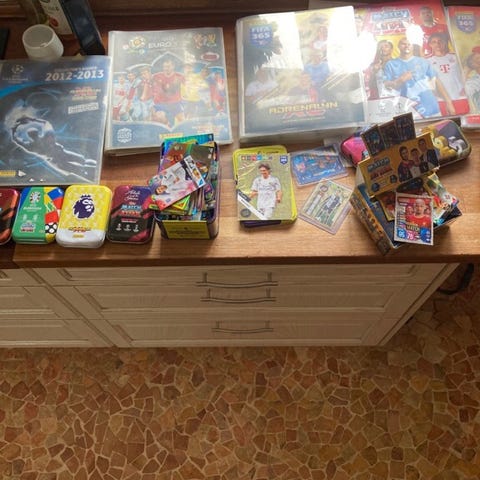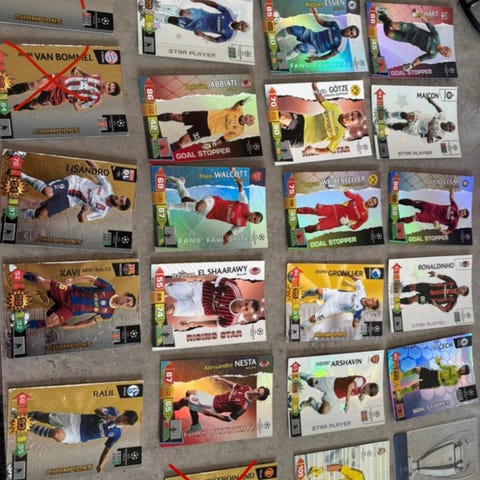Blandet bunke med gamle fodboldkort. Primært fra Champions league 2010-2011 og Champions League 2011-2012. Flere “Master” og “Limited Edition” kort ibland, med store navne som Messi og Ronaldo med flere.