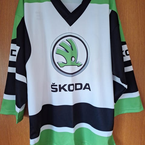 Škoda ishockeytrøje nr. 93 i størrelse XL. Trøjen har V-hals og lange ærmer. Farven er lys grøn med mørkegrønne detaljer og Škoda-logo på bryst, ærmer og ryg. Nummer 93 er trykt stort på ryggen. Trøjen er fremstillet i et let, syntetisk materiale egnet til ishockey og anden sport eller fritidsbrug.