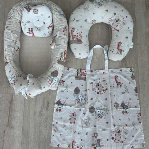 Ammepude og barnevognspude er ikke brugt. Babynest brugt sparsomt. Born Copenhagen Grey leaf.