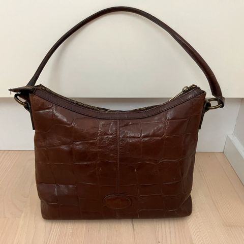 Rigtig fin Mulberry håndtaske, der har remme der er så lange at den også kan bruges som skuldertaske. Modellen hedder mig bekendt "Kensington". Den er i sort læder med croco præg og med det kendte Mulberry prægede bordeaux/sorte for (se fotos). Den lukkes med lynlås og har desuden indvendig lynlåslomme. Den er yderst rummelig.