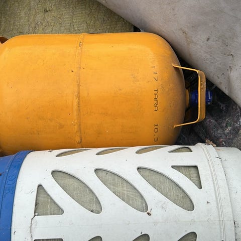 Gule gasflasker i metal. Velegnet til opbevaring af gas til f.eks. grill, varmeapparater eller andre gasdrevne enheder. Flaskerne har bærehåndtag og ventil i toppen. Størrelse og kapacitet fremgår ikke tydeligt af billedet og bør kontrolleres ved afhentning.