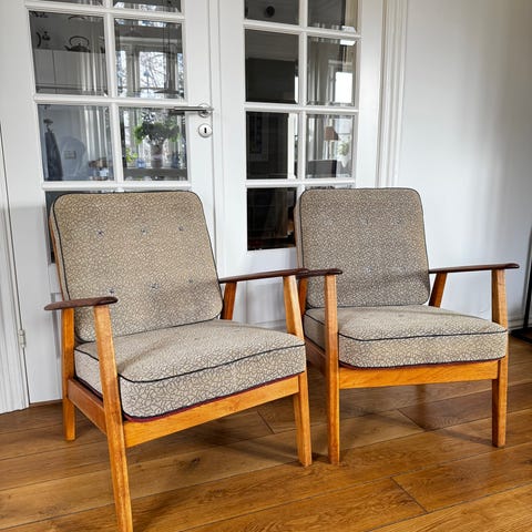To flotte lænestole i massiv teaktræ. Originale hynder i fantastisk kvalitet. De har stået på et loft siden de blev købt tilbage i 60'erne, så det ligner de er friske ud af fabrikken/snedkeren. Står utrolig flotte og uden fejl.