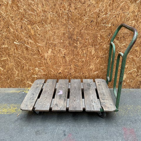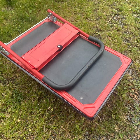 Sakseløftevogn platformvogn med håndtag. Vognen har en solid, rektangulær platform og sakseløft, så arbejds- eller læssefladen kan hæves og sænkes. Udstyret med hjul for nem flytning og et fast håndtag til styring. Velegnet til transport og håndtering af gods i f.eks. lager, værksted eller garage.