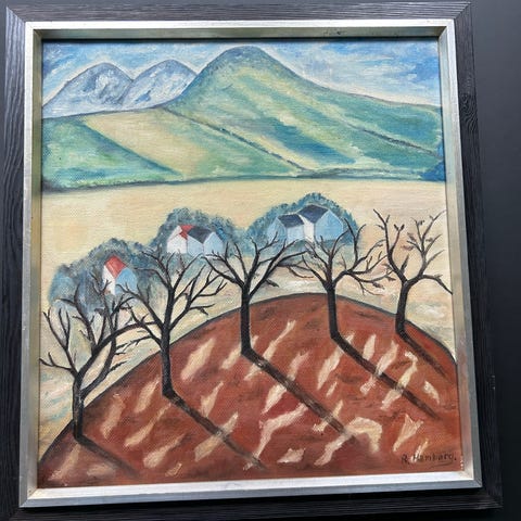 Landskabsmaleri med motiv af skov, bjergside og sti i forgrunden. Maleriet er udført på lærred og monteret i en profileret guldfarvet ramme. Bagsiden viser lærred med påskrift og ophængswire. Velegnet som vægdekoration i stue, gang eller kontor, hvor et naturmotiv ønskes som billede på væggen.