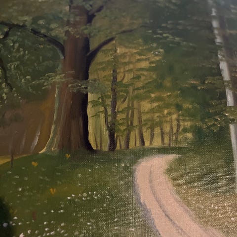 Landskab maleri med skov og sti i guldramme