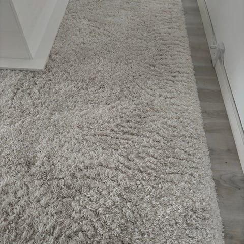 IKEA tæppe i rektangulær form med lang luv. Tæppet har et mønstret design i blå, sort og lyse nuancer. Egnet til brug i stue eller andre opholdsrum på hårde gulve for at give en blødere overflade og dæmpe lyd. Materiale og præcise mål er ikke oplyst.