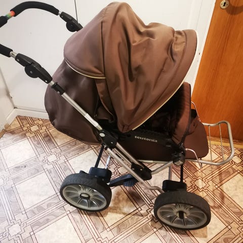 Teutonia klapvogn i brun farve. Vognen har justerbart ryglæn og stor kaleche. Den er udstyret med fire hjul og stel i metal med kurv under sædet til opbevaring. Egnet til transport af ét barn og kan bruges til hverdagskørsel og gåture.