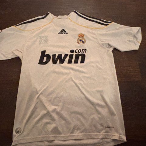 Adidas Real Madrid fodboldtrøje i sort. Trøjen er en officiel klubtrøje med Real Madrid-klublogo på brystet og Adidas-logo samt sponsortryk på fronten. Designet har korte ærmer og rund hals. Skulderne har karakteristiske Adidas-striber i kontrastfarve. Fremstillet i Adidas ClimaCool-materiale, som er et let og åndbart polyesterstof egnet til fodbold og anden sport. Velegnet som trænings- eller kamptrøje for fodboldspillere og som klubmerchandise til fans af Real Madrid.