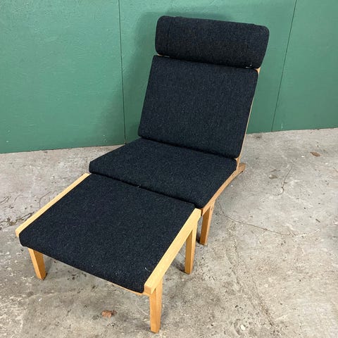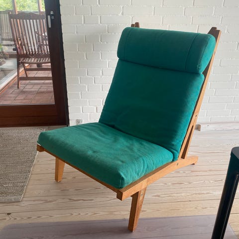 Hans J. Wegner lænestol med polstret sæde og ryg i gråt tekstil og stel i træ, formentlig eg. Stolen har lav siddedybde og skråt ryglæn, samt synlige trædetaljer på sider og bagstykke. Velegnet som loungestol i stue, læsehjørne eller som ekstra siddeplads i opholdsrum.