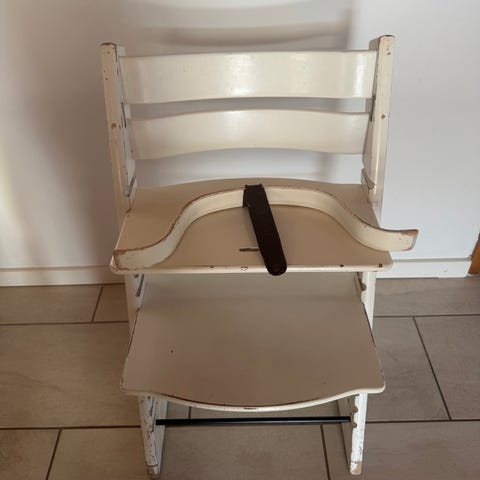Stokke Tripp Trapp højstol i hvidlakeret træ. Klassisk justerbar højstol med fodplade og siddeplade, der kan tilpasses barnets højde. Egnet til brug ved spisebordet for børn, som kan sidde selv. Farve: hvid. Materiale: træ.