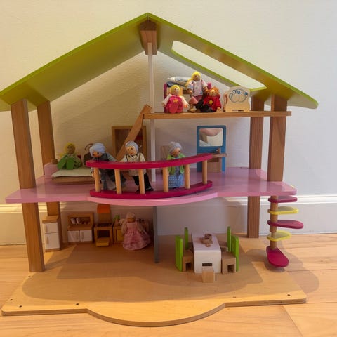 Minimumspris er 750. Det er slået op flere steder. Sættet omfatter forskellige møbler og småting til indretning af flere rum i et dukkehus, blandt andet seng, vugge, kommoder, skabe, spise- og sofabord, badekar, også et i provenuneutral, håndvask, toilet, reoler, lamper, vaskemaskine, symaskine, køkkenrulleholder, og køkkenudstyr. Der medfølger også service, dekorationer og andre små dele, som kan bruges til at indrette stue, soveværelse, badeværelse, køkken og børneværelse i et dukkehus. Der er tale om tilbehør i f.eks. alder.