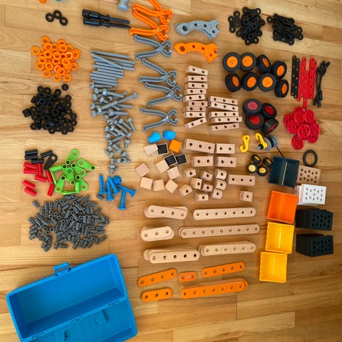 BRIO byggesæt i trælegetøj med forskellige dele til samling af køretøjer og konstruktioner. Sættet består af træstave med huller, hjul og samleelementer i plast, som kan skrues sammen på flere måder. Egnet som konstruktionslegetøj til børn, der vil bygge og samle egne modeller.