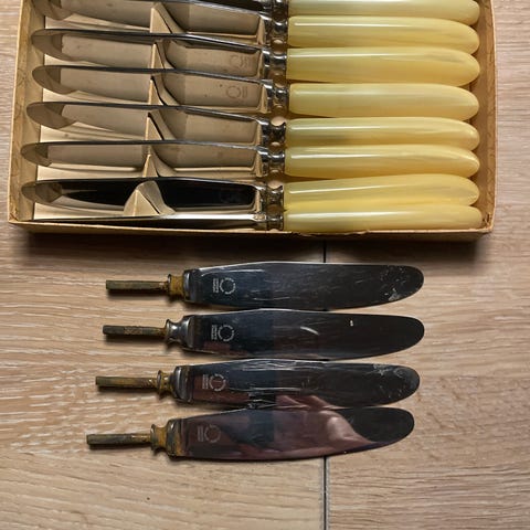 lagkagekniv i rustfrit stål med mørkt træskaft.