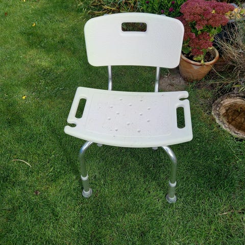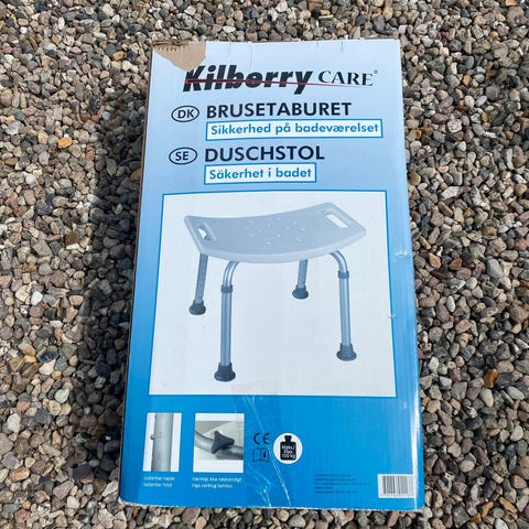 Fin og funktionel badestol. Har justerbar højde, afløbshuller i sædet og holdere til krykker. Super praktisk, hvis man er gangbesværet eller kommet til skade. Den har kun været brugt få gange over et par måneder i forbindelse med min kæreste brækkede foden.