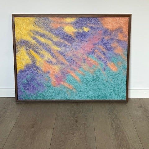 Abstrakt maleri med farverigt motiv i træramme