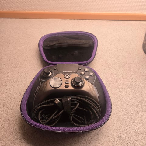 Xbox Elite Series 2 controller i sort. Trådløs gamepad til Xbox-konsoller og pc. Leveres i hårdt etui med udskiftelige tommelfingersticks, styrekryds og ekstra knapper, som ses på billederne. Egnet til gaming, hvor der ønskes justerbare knapper og ekstra tilpasningsmuligheder.