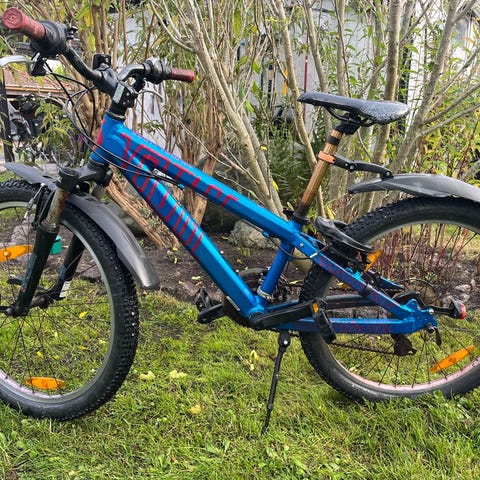Scott mountainbike til unisex med stelstørrelse M og 24" hjul. Cyklen er udstyret med skivebremser for og bag samt gearsystem med kassette bagpå. Egnede anvendelser omfatter kørsel på både vej og lettere terræn. Farven fremstår som mørk med lyse detaljer, og cyklen har standard flade pedaler og rette styr. Velegnet til ryttere, der passer til en M-stelstørrelse og ønsker en mountainbike med 24" hjul.