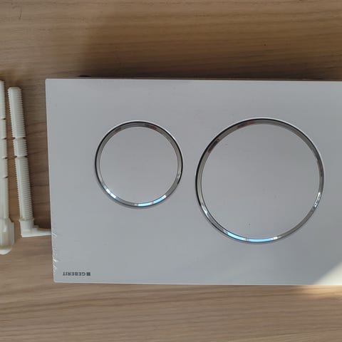 Geberit Sigma 40 square betjeningsplade til Geberit sigma indbygningscisterne. Frontpladen har to runde trykknapper til dobbelt skyl og fremstår i en messingfarvet overflade. Leveres med monteringsramme. Dog uden tryk pinde. De koster 100kr på nettet.