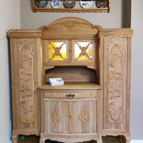 Vitrineskab i brunt træ med overdel og underdel. Overdelen har glaslåger og flere indvendige hylder til opbevaring og udstilling af service, glas eller pynt. Underdelen har skuffer og skabslåger med træfyldninger samt ekstra opbevaringsplads. Skabet står på ben og har udskårne detaljer på sider og fronter. Særdeles anvendeligt.