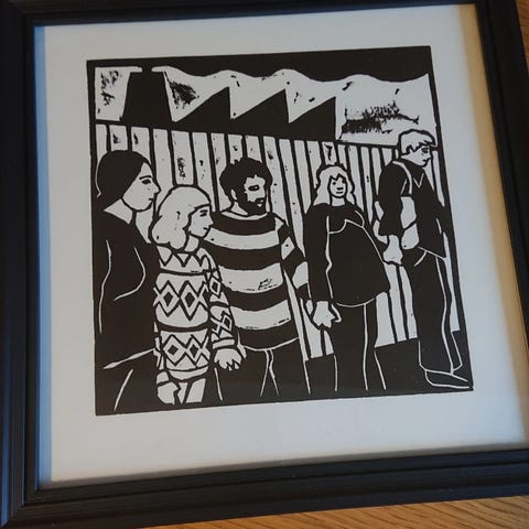 Sender ved køb for 75 kr og derover / retrohjem / kollage med 6 illustrationer / smukt indrammede løsblade fra romanen Vinterbørn og Den indre by / retrocool indretning / moderskab / familieliv / mulig rabat ved køb af flere annoncer / genanvendelig livsstil