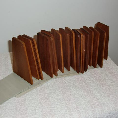 Bogstøtter i træ og metal i brun og sort. Består af fire enkeltstående støtter med buet træfront og sort metalfod. Egnet til opbevaring og organisering af bøger på hylde, skrivebord eller reol. Materialekombinationen giver en stabil støtte til bøger i forskellige størrelser.