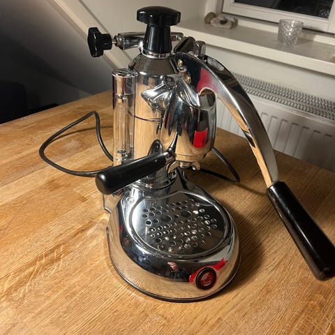 Europiccola model fra La Pavoni. Enkelt stempelsystem med håndtag. Yderst smuk maskine, der dog desværre er utæt og har brug for nye pakninger eller lignende.