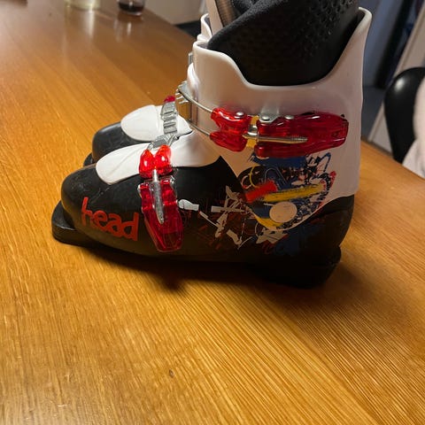 Stropperne på begge støvler har løsrevet sig fra velkroet og plastikstropperne foran er knækkede.