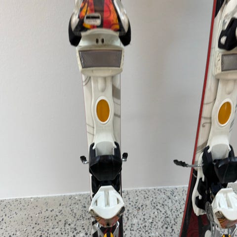 De er lidt slidte i toppen og plastic’en sidder løst nogle steder på bindingerne, som det ses på billederne, men skiene fejler ellers ikke noget og har ikke store skader på undersiden.