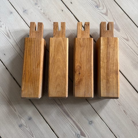 IKEA sengeben i træ i naturfarve. Sættet består af fire ben med metalgevind til montering på seng eller sengeramme, der er kompatible med IKEA-senge.