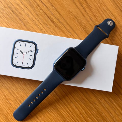 Apple Watch Series 7 smartwatch med 45mm urkasse i midnight aluminium og midnight sportsrem (størrelse M/L). Uret er meget velholdt.