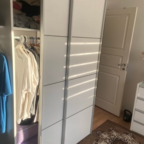Ilva garderobeskab med skydelåger i hvid. Skabet har to store skydelåger på frontsiden og indvendig indretning med bøjlestang til ophæng af tøj samt trådkurve/hylder til opbevaring. Velegnet som garderobeskab i soveværelse eller gang til opbevaring af tøj og tekstiler.