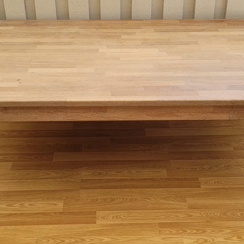 Sofabord med bordplade af genbrugstræ og stel af metal.