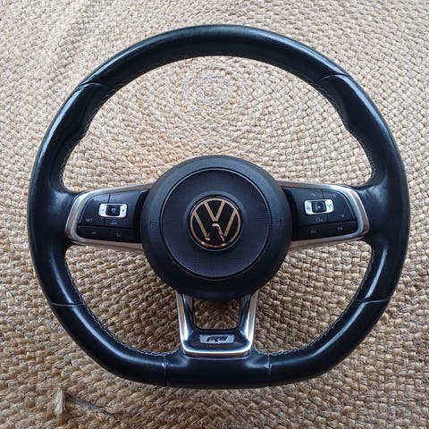 VW Golf 7.5 GTI rat med røde syninger. Rattet har integrerede multifunktionsknapper i begge sider til betjening af bl.a. lyd og køreassistenter. Nederst på rattet er der GTI-logo. Der er udskæring i midten til montering af airbag, som ikke medfølger.